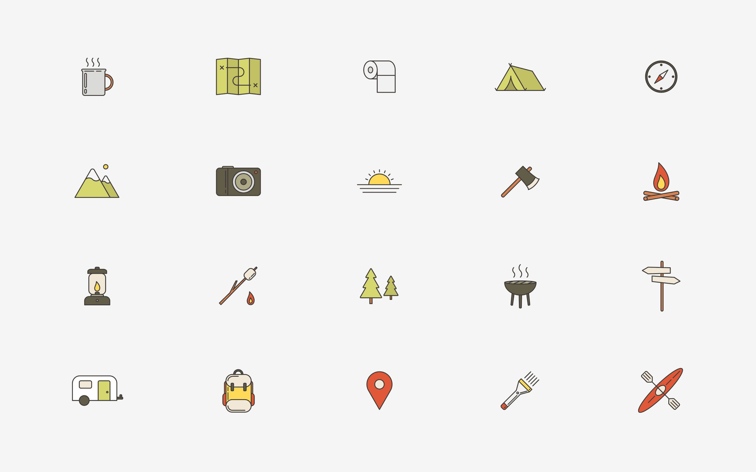 Set of camping-themed icons using earthy color palettes, designed to convey outdoor adventure and nature-inspired aesthetics in a cohesive and visually appealing style.