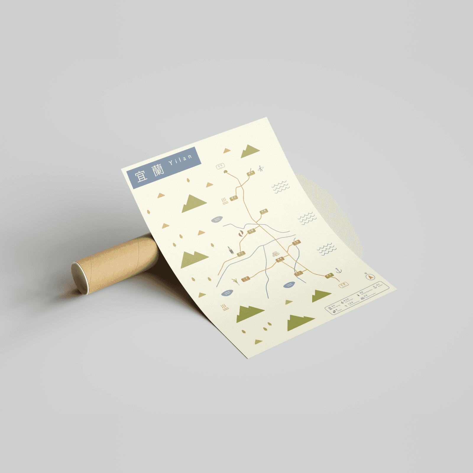 An illustrative map poster of Yilan City, combining stylized natural motifs with distinctive icons for each township to create a visually engaging and informative design that celebrates the region’s unique character.